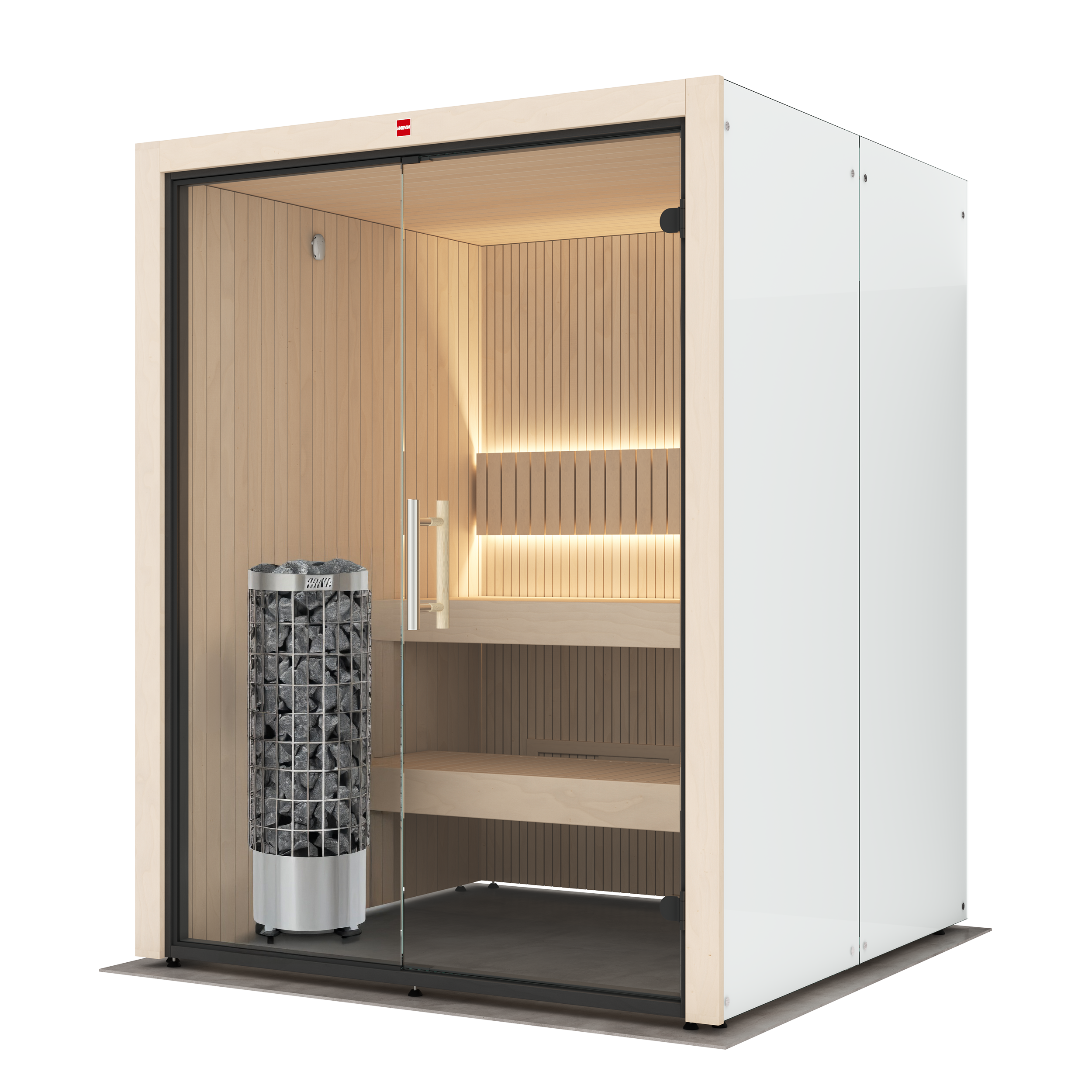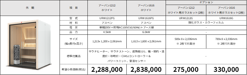 アーバンシリーズは、日本の住宅で一般的な白色クロスの壁面にも美しく調和する、モダンでスタイリッシュなデザインを特徴としたサウナキャビンです。